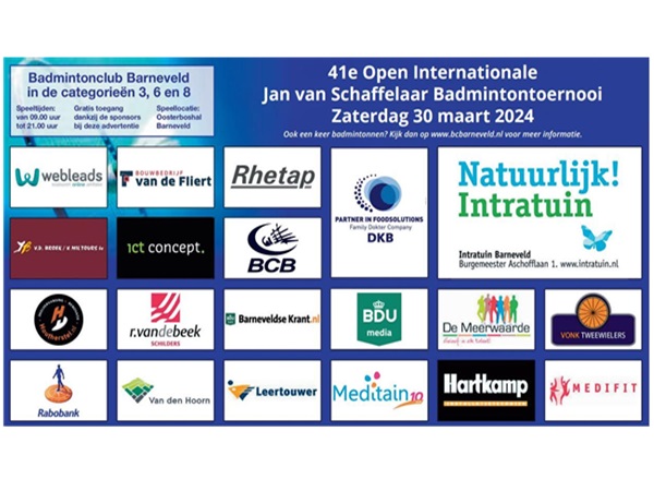 Op zaterdag 30 maart vind ons 41e Jan van Schaffelaar toernooi plaats. Mede mogelijk gemaakt door ons vele sponsors die we bij deze van harte willen bedanken.